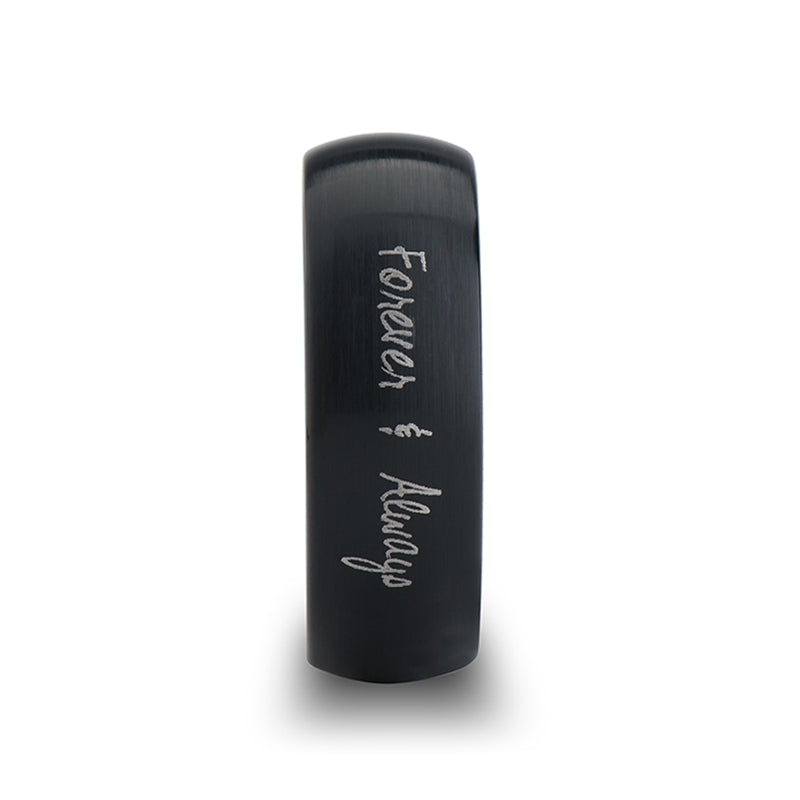 The intricate details of this custom handwriting engraved wedding band reflect volumes in the three simple words engraved over the brushed black surface. Simple yet like the bond between you and your 'forever' will reach deeper than the depths of the color it exudes. May your 'always' ever light your path, and may you cherish it's brightness until the end of time. The color of the band evokes such depth. Black, can you think of a color more deep? When nature appears, we imagine trees, forests, maybe the sky and the surface of the water beneath it reflecting its glory. The sun, shining over fields of sunflowers reflecting its abundance. But think of black and we often see ourselves. We see our innermost thoughts reflected back in all of their glory. There is a forever and always in your mirror and this ring is here to prove it.