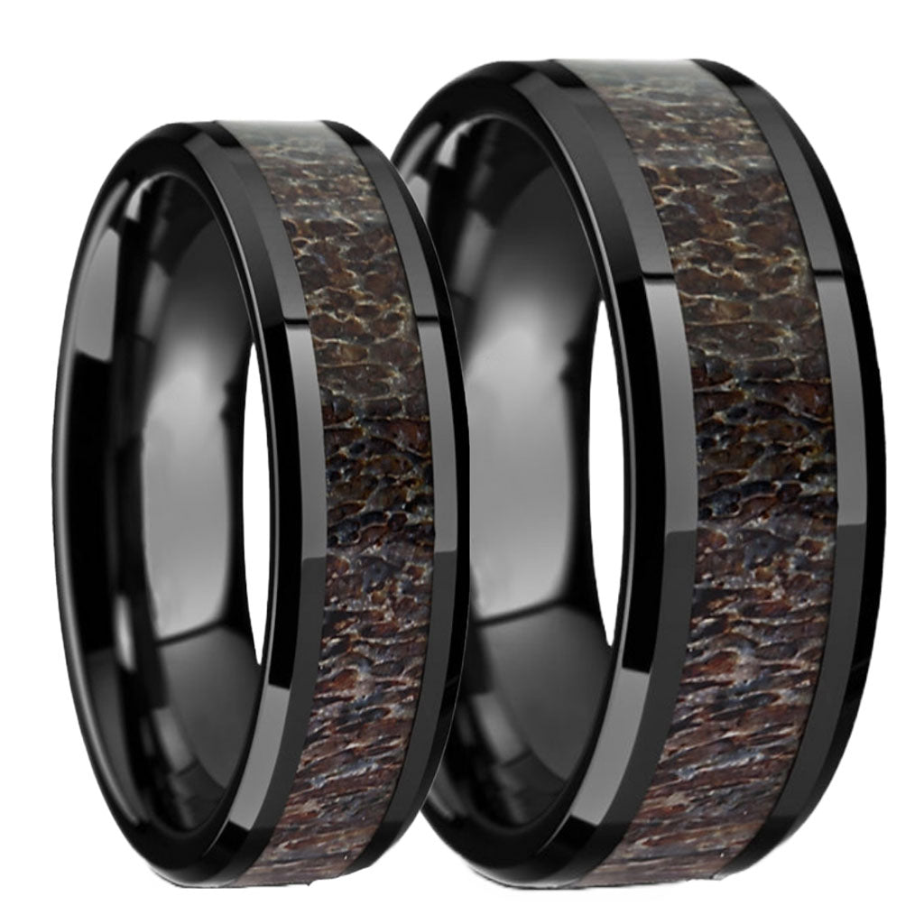 Deer Antler Inlaid Black Ceramic Couple's Matching Wedding Band Set