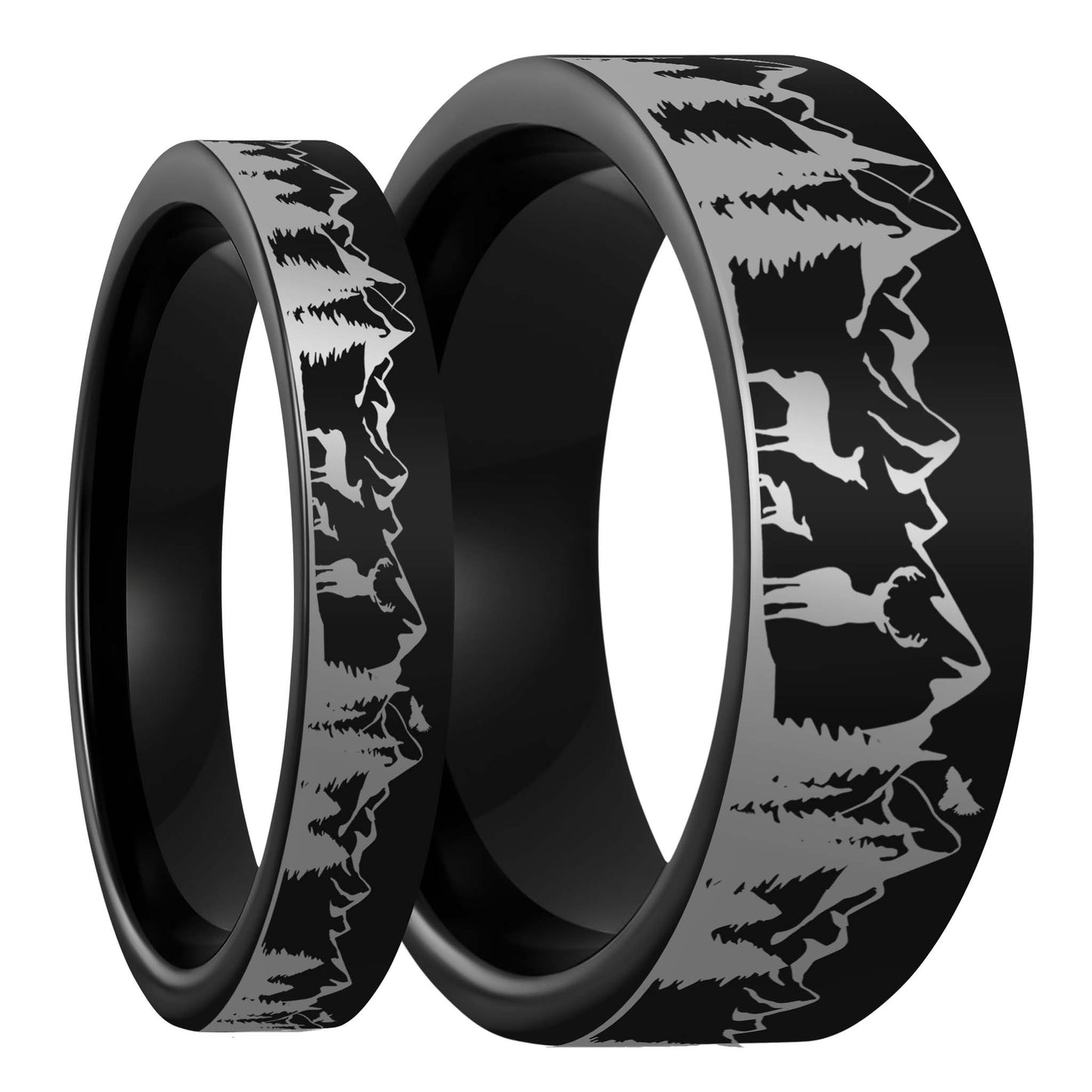 Couple's Matching Deer & Mountain Range Black Tungsten Wedding Band Set Details