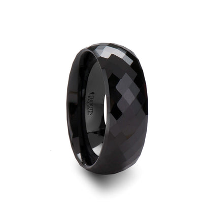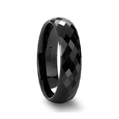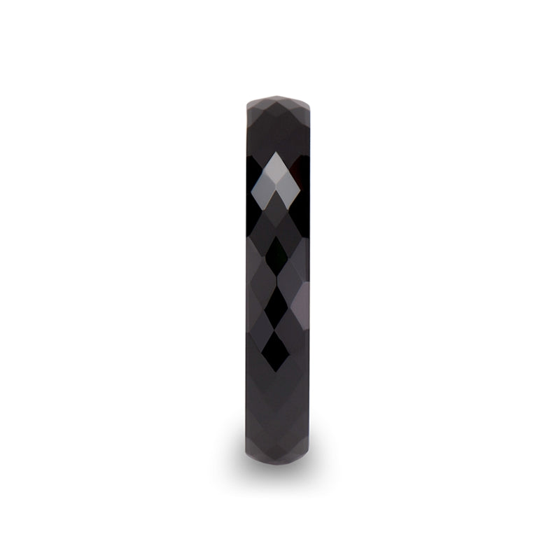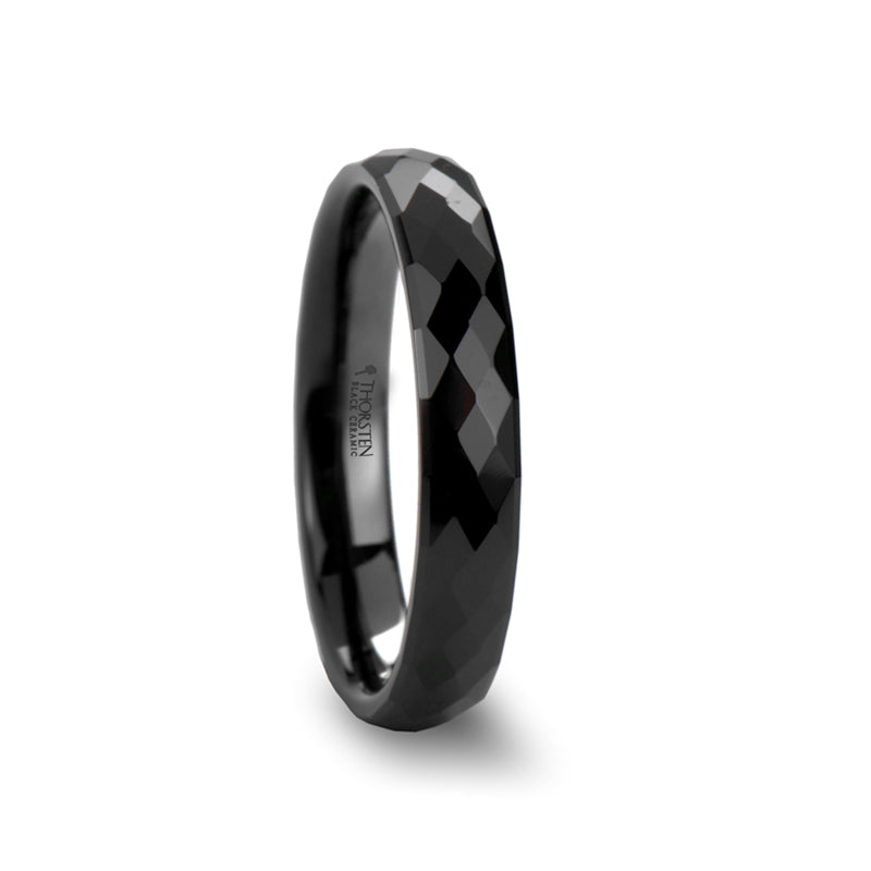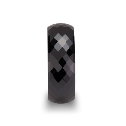 Our diamond faceted black ceramic wedding band is a sleek and stylish choice for a modern ring. It has a polished finish that compliments the nearly 300 bevels on the surface. The light will subtly reflect off this ring and bring a sparkle into your life, just as your spouse has done! This ring is certainly unique enough as-is, but if you would like that extra touch of personalization, add a custom message to the inside of the wedding ring with our simple engraving service. Say goodbye to the typical boring wedding band and step into something unique and eye-catching. Made with high-quality black ceramic, this ring boasts a diamond faceted finish that sparkles and shines with every movement. Not only is this ring visually stunning, but it's also durable and low maintenance. The ceramic material is scratch-resistant, hypoallergenic, and won't tarnish over time, making it perfect for those who want a long-lasting ring that won't require constant upkeep. Buying this ring means investing in a piece of jewelry that will last a lifetime. Whether you're buying this ring for yourself or as a gift for someone special, it's the perfect way to show your commitment and love. Order now and experience the beauty and quality of our diamond faceted black ceramic wedding band.