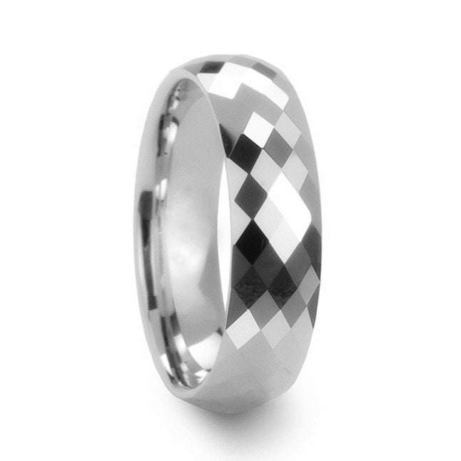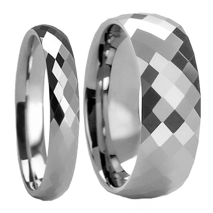 Wear the symbol of your love for each other like a suit of armor, proudly, like the diamond facets that brilliantly shine in this set of wedding bands. These rings are not only affordable, but they're also built to last. The diamond faceted finish adds a touch of elegance and sparkle without being too flashy. And with the lifetime warranty, you can have peace of mind knowing that any damage or size exchange is a breeze. Gone are the days where you have to settle for less, our pair of rings are perfect for couples wanting high-quality bands without the hefty price tag. Made with white tungsten, known for its durability and scratch-resistant properties, you won't ever have to worry about your rings losing their shine or shape. Forget about the traditional, boring wedding band. Our diamond faceted white tungsten couple's matching wedding band set is the perfect choice for couples looking for something unique and stylish. It's time to add some flair to your special day with a pair of rings that will make a statement for years to come.