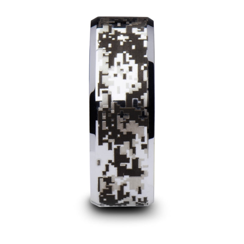 This is the age of technology and gadgetry, why not extend the trend to the wedding band industry? Our camo wedding band has been stunningly designed to portray a digital version of camouflage. With the camouflage engraved design, this ring is perfect for those in the military. Tungsten is extremely durable and super scratch resistant, so this ring is nearly as tough as the ones who wear the uniform. There is a wedding band out there for everyone and we intend to help you find the perfect fit. A wonderful, modern, and budget friendly option that doesn't sacrifice quality, this men’s camo ring comes with a satisfaction guarantee. This is the perfect wedding band to represent your love, honor, and commitment.