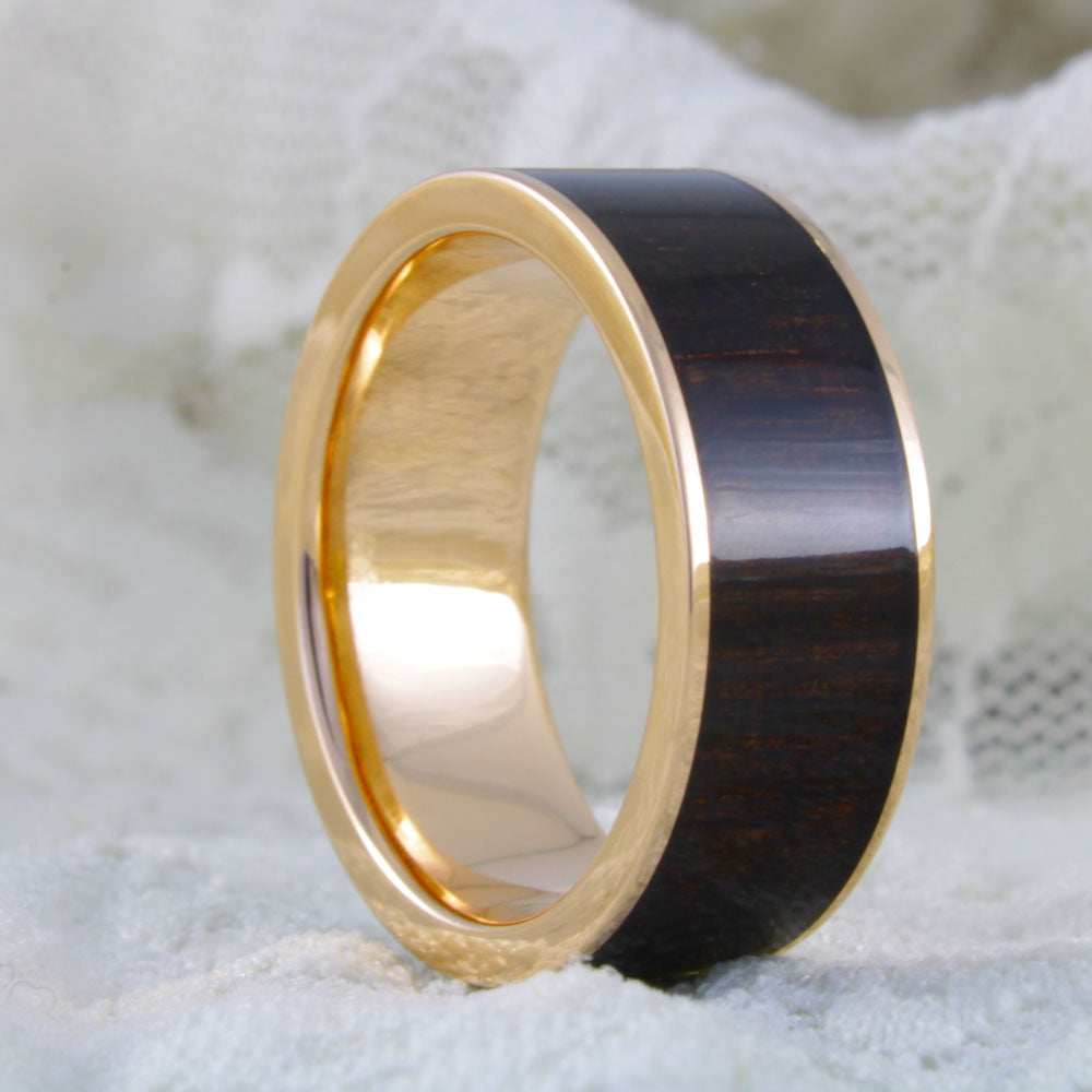 The exotic Ebony inlay of this classic 14k gold flat wedding band shows off the deep, dark mysterious colors of the wood. A hard wood that is prized for carving, your ring will stand up to wear and tear of everyday life beautifully. Distinguished is the word they will use in your presence. With grace, this ring will become a favorite and valued addition to your personal jewelry. Like your love, this ring will deepen with meaning over time. Utilizing the stylish 14k gold to contrast with the deep color of the wood makes this ring a prevailing choice for any man.