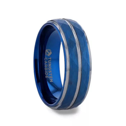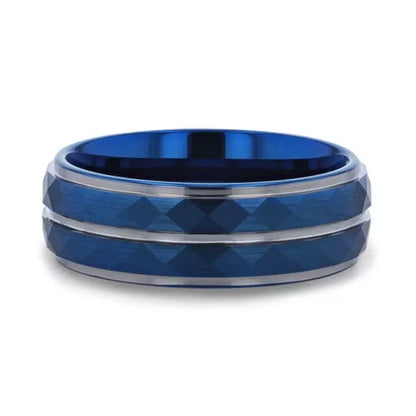 To honor your vows and commitment to your significant other, you’ll require a wedding band that boasts a deep meaning, just like this brilliant blue wedding band for gents. Blue is the color of loyalty and trust. The faceted design of this blue ring gives it a more impactful style that will always make a lasting impression on anyone who sees it. Elegant and stunning, this flat band that comes with a striking brushed finish is complemented by a comfort fit interior that makes the ring all the more comfortable and an absolute joy to wear. Its refined design doesn’t take away from the ring’s tough build. The piece is constructed using a premium quality material—tungsten. The material is unmatched when it comes to tensile strength, meaning it won’t scratch, bend, or lose shape. All of these exceptional attributes packed into one ring are the true definition of the perfect ring.