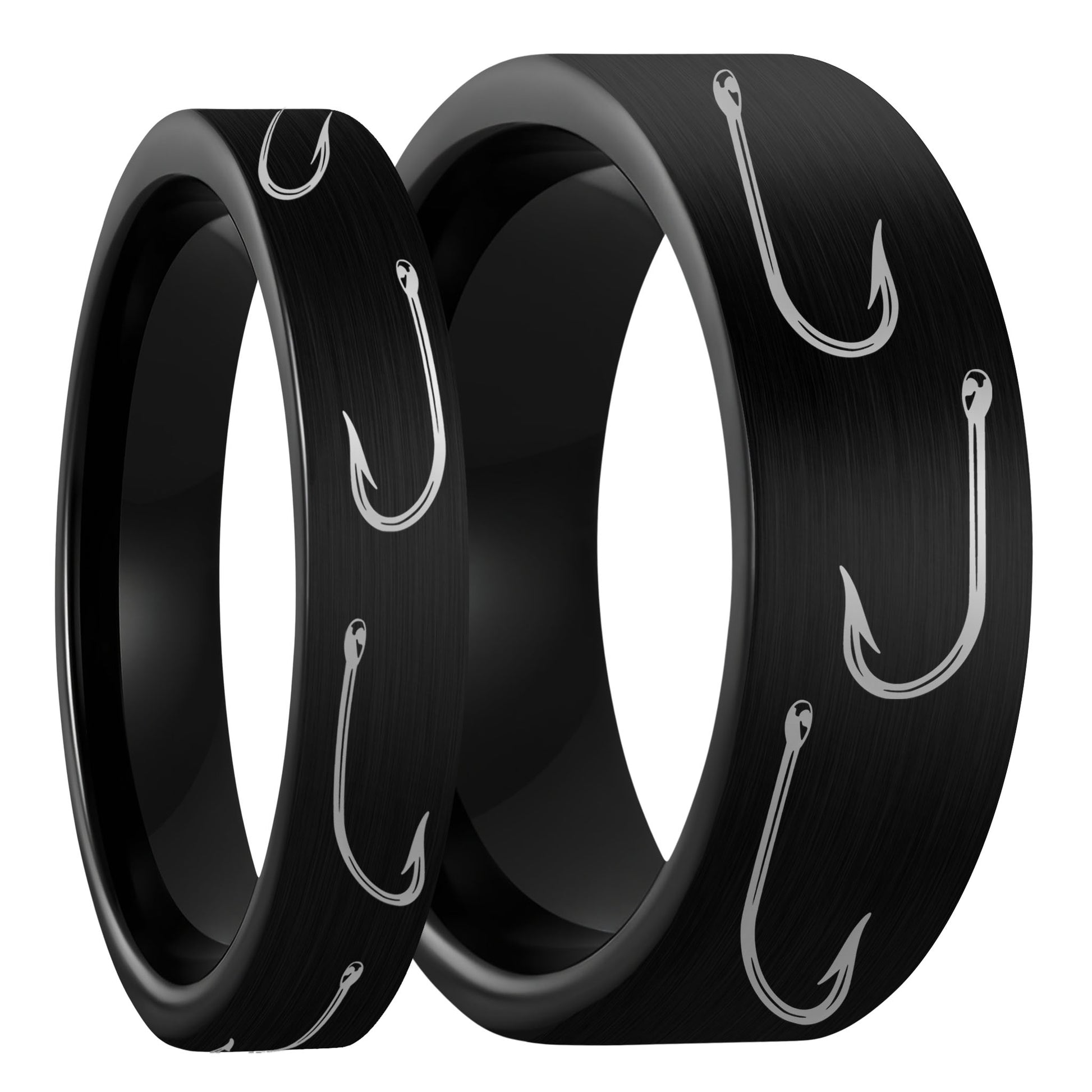 Fishing Hook Brushed Black Tungsten Couple's Matching Wedding Band Set
