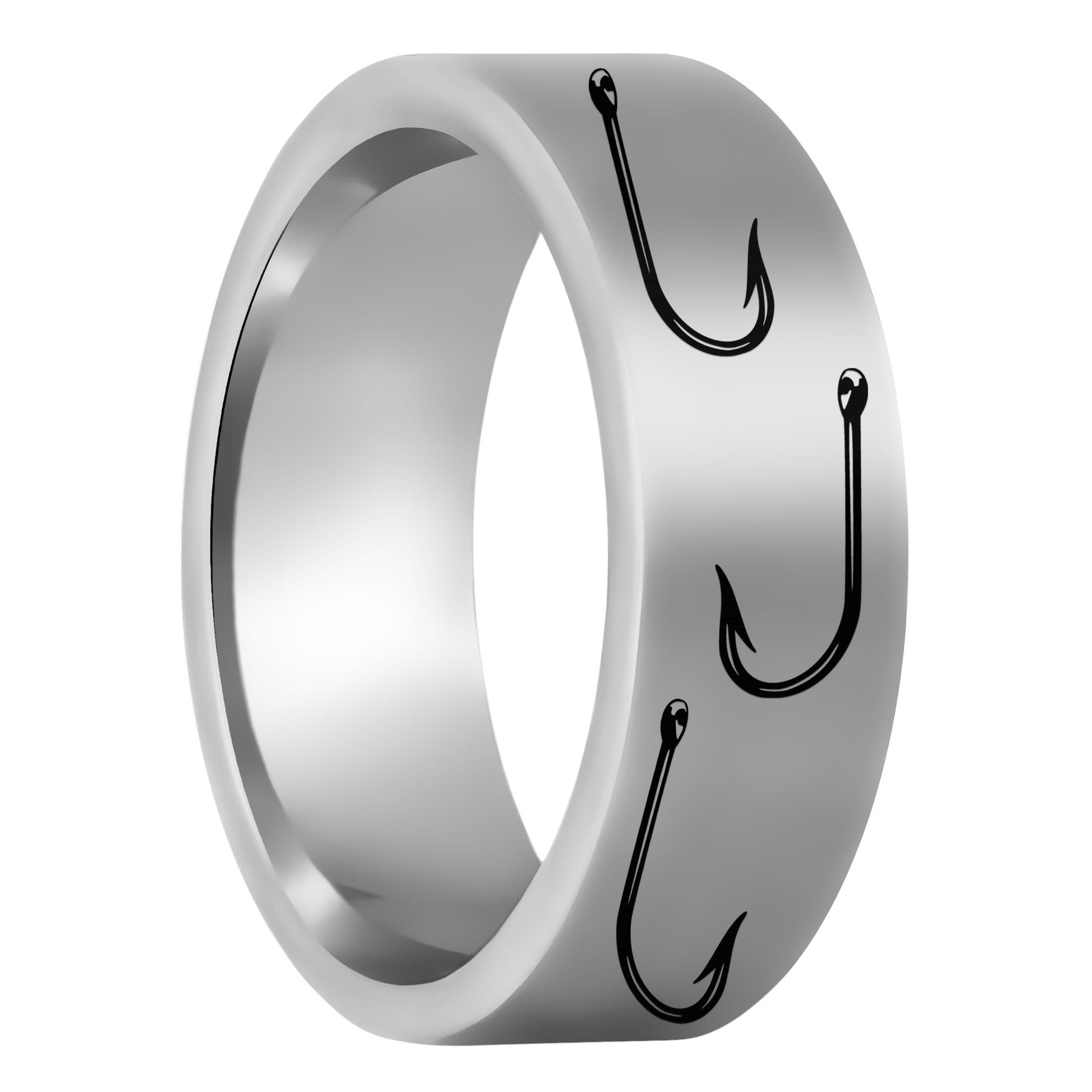 A simple wedding band with a lot of character, this artistically engraved fishing hook pattern around the entire ring will attract anyone who is into fishing and the outdoors. Made from extraordinarily tough tungsten metal, this ring will be sure to withstand that fishing trip or any kind of outdoor activity! For the fisherman or woman in your life, or if you enjoy the outdoors yourself, this ring will bring one so much joy! Unique and outstanding, the fishing hooks will bring out your individuality and strike up conversation with how unusual and striking the appearance of this ring is. This unique and stylish ring is perfect for couples who love to fish and want a wedding band that reflects their passion. Made from durable tungsten, this ring is scratch-resistant and built to last a lifetime. Not only is this ring tough, but it also features a sleek and modern design that's sure to turn heads. The fishing hook design is subtle yet eye-catching, and the polished finish gives it a sophisticated look. Whether you're wearing it on the water or at a fancy event, this ring is sure to impress.