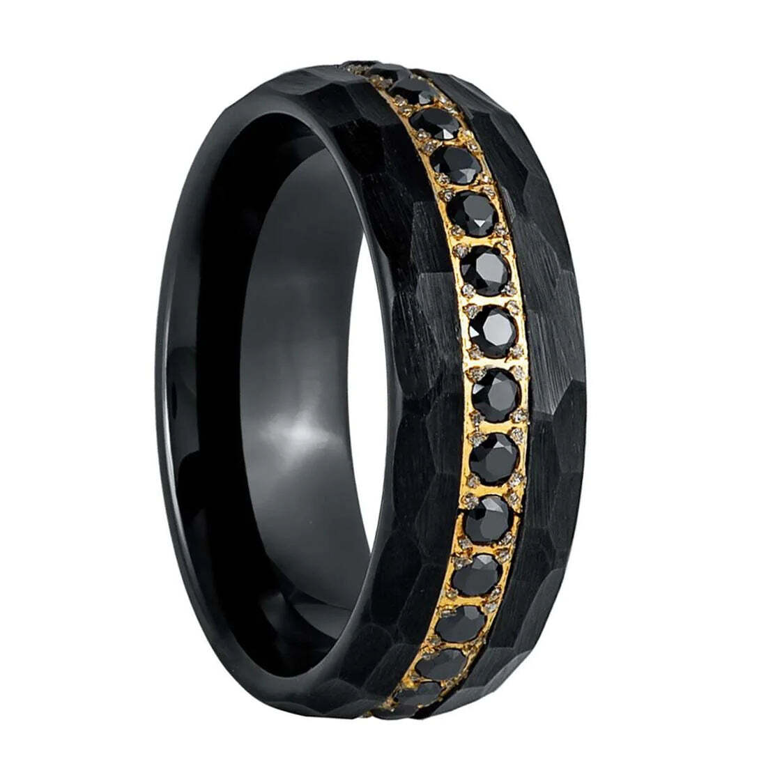 Gold & Black Cubic Zirconia Hammered Black Tungsten Men's Wedding Band