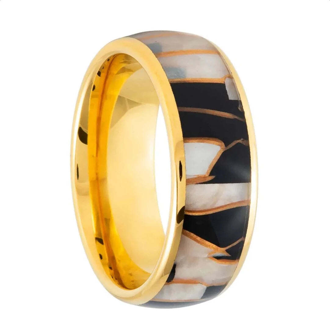 Ready to tie the knot but don't want to overspend on a wedding ring? Look no further than our gold tungsten men's wedding band with mosaic inlay. This stunning piece features a unique mosaic design that is sure to catch the eye, whether you're walking down the aisle or just out for a night on the town. Made from high-quality tungsten, this ring is durable enough to withstand daily wear and tear, while the gold finish adds a touch of class that won't go unnoticed. Not just for weddings, this ring makes a great gift for any occasion. Show your loved one how much you care with a gift that's both stylish and practical. And at our unbeatable price point, you won't have to settle for anything less than the best. With our gold tungsten men's wedding band with mosaic inlay, you can have it all: quality, style, and affordability.