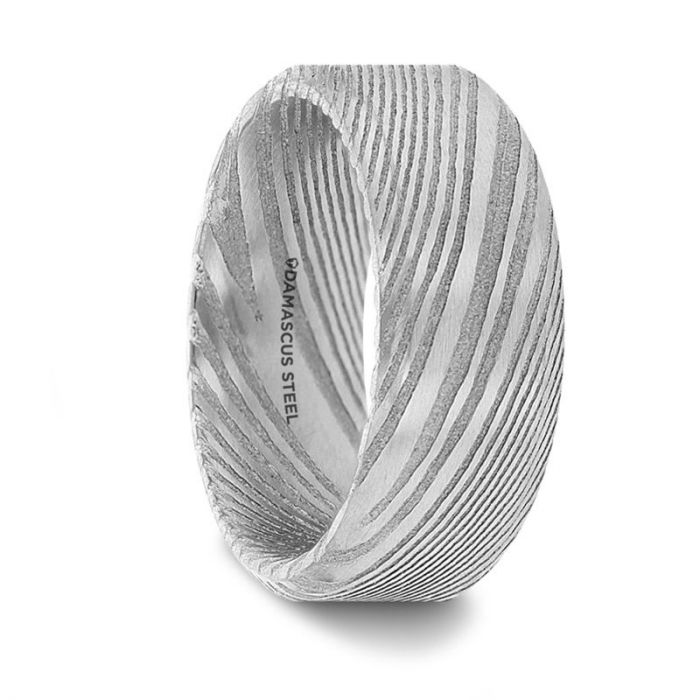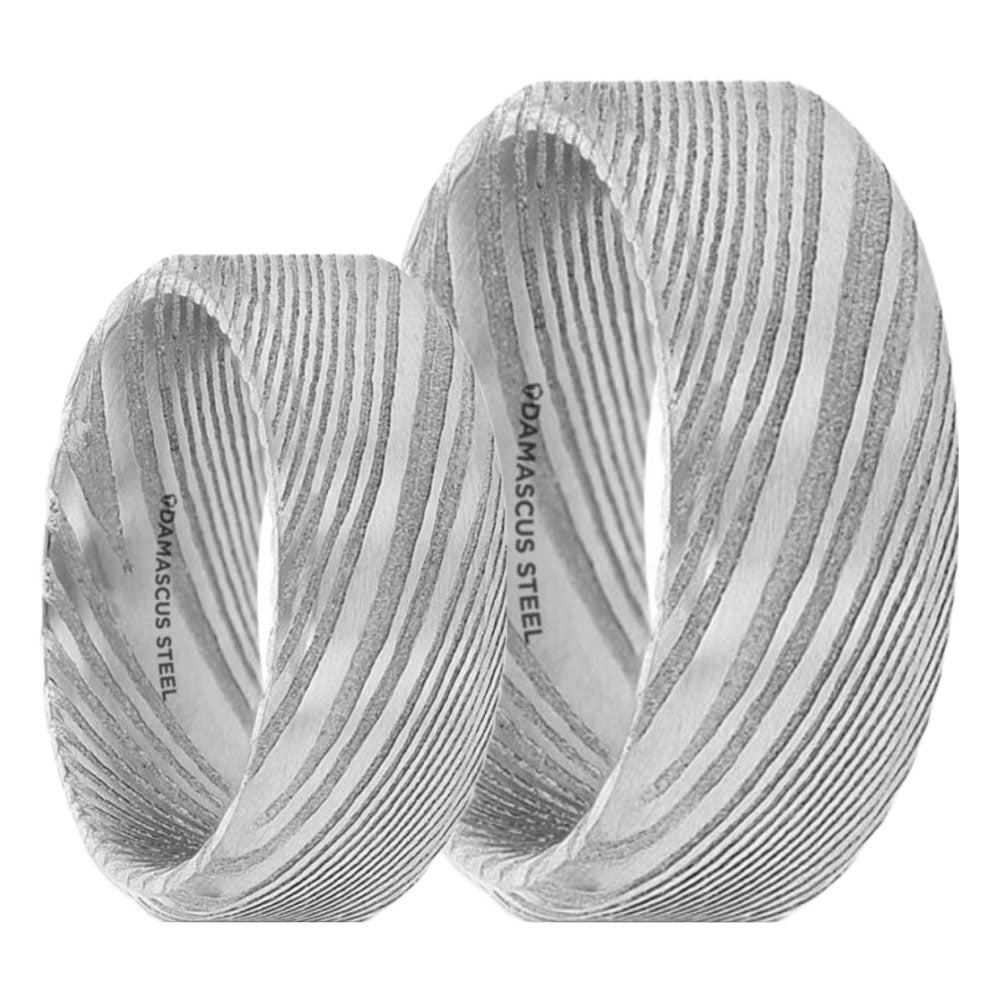 Couple's wedding bands don't just have to be plain rings. And this is a perfect example. Modern cool has never looked this good with the Damascus steel couple's wedding band. With a bright gleam that will make people glance twice every time you move your hand, this number will let everyone know you're taken, and mighty proud of it. This contemporary matching wedding band set crafted from a sturdy metal is scratch-resistant. It's characterized by grey banding patterns that showcase an elegant design. Made using warrior metal, you can wear this ring without worrying about wear and tear. It will withstand even the harshest conditions and still maintain its signature style. What's more, it an exceptional piece that you'll cherish through the years. This ring set is unrivaled in strength and legendary in its appearance on your hand. Seal your union in style with this breathtaking number that's versatile enough to match any wedding attire and your entire wardrobe thereafter.