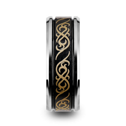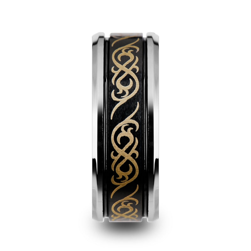 Grooved Black Tungsten Wedding Band with Engraved Celtic Pattern