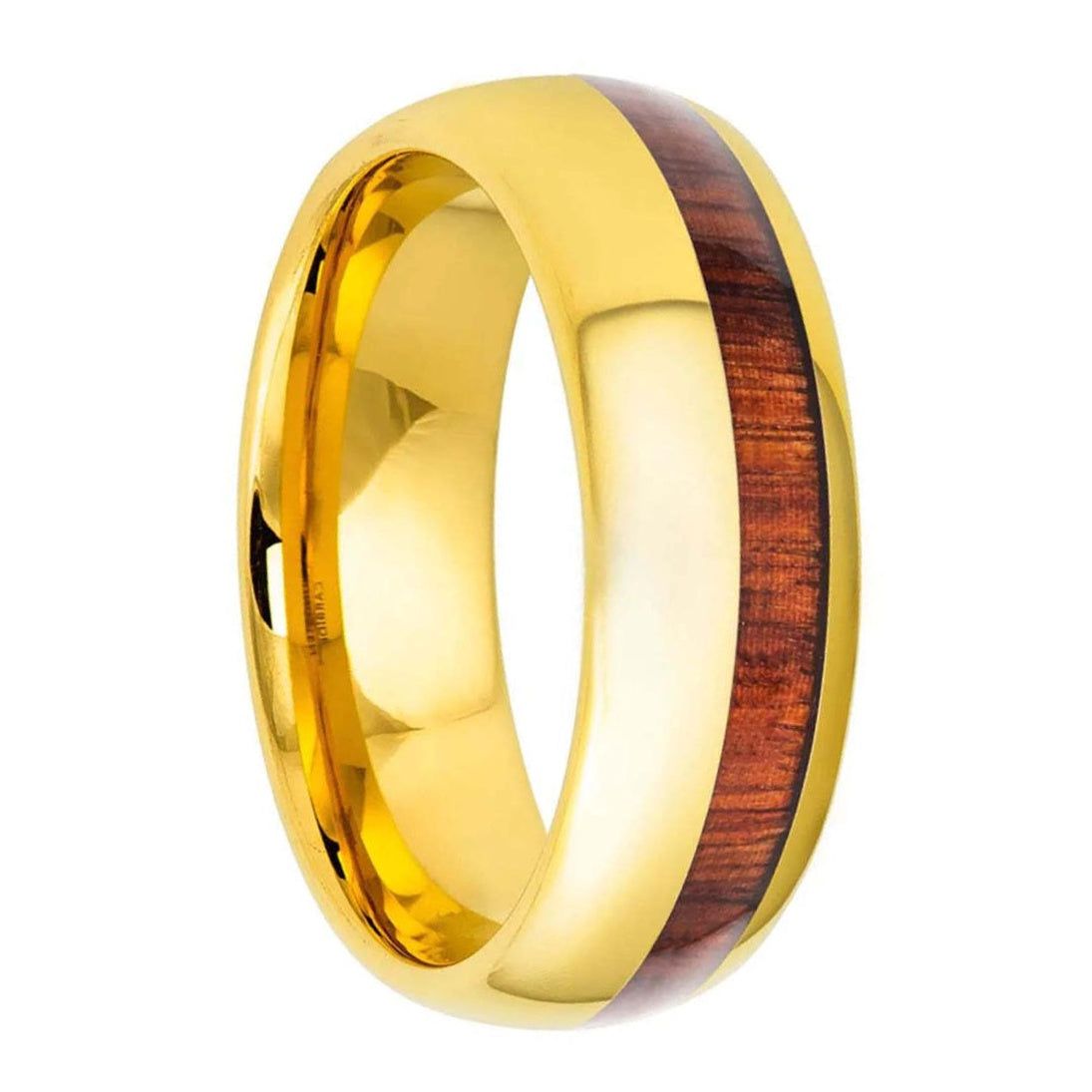This isn't your average men's wedding band. Our half Koa wood inlaid gold tungsten ring is a stunning and unique piece that will take your style to the next level. The gorgeous Koa wood inlay combined with the shining gold tungsten makes for a handsome and eye-catching accessory that is sure to impress. Not only does this ring look great, but it's also incredibly durable. Tungsten is one of the strongest metals out there, so you can wear this ring every day without worrying about scratches or dings. It's the perfect choice for the active guy who wants to look sharp without having to be too careful. Plus, at our affordable price point, you can get a high-quality ring while remaining affordable. Whether you're getting married, looking for a gift for your partner, or just want to treat yourself to something special, this half Koa wood inlaid gold tungsten ring is the perfect choice. So why settle for something boring when you can have something unique and stylish? .