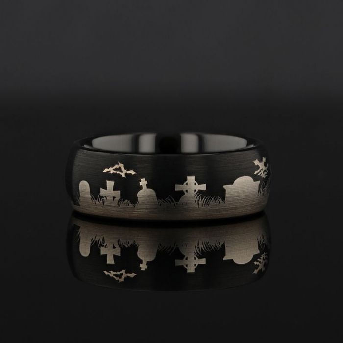 Halloween Graveyard Engraved Black Tungsten Wedding Band