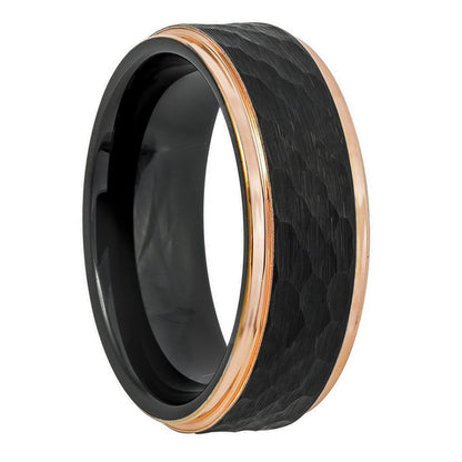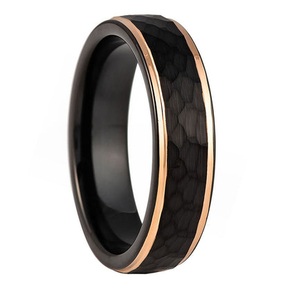 Hammered Black Tungsten Men's Wedding Band with Rose Gold Edges