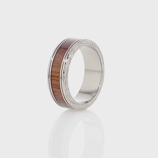 Koa wood was not meant for jewelry. The tree comes from the island of Hawaii and was used by the local community to create boats and tools for going out to sea and finding fish. The Hawaiian people understood that this tree was to be respected because it gave them life; the ocean is life on the island. But what makes the Koa tree so important? The hard wood. As a hardwood species, the tree matures over decades. The result is strong wood that is able to withstand the rigors of the sea and rough weather. The Koa wood is also not easily weakened by boring pests. This Koa Wood Inlaid Titanium Men's Wedding Ring with Intricate Edges was made to capitalize on the symbolism of the Koa wood tree. The strength of character along with the integrity are all qualities that are highly desirable in a marriage. This ring is made to inspire depth of character, and we invoke the strength of the Koa in your marriage as you wear it.
