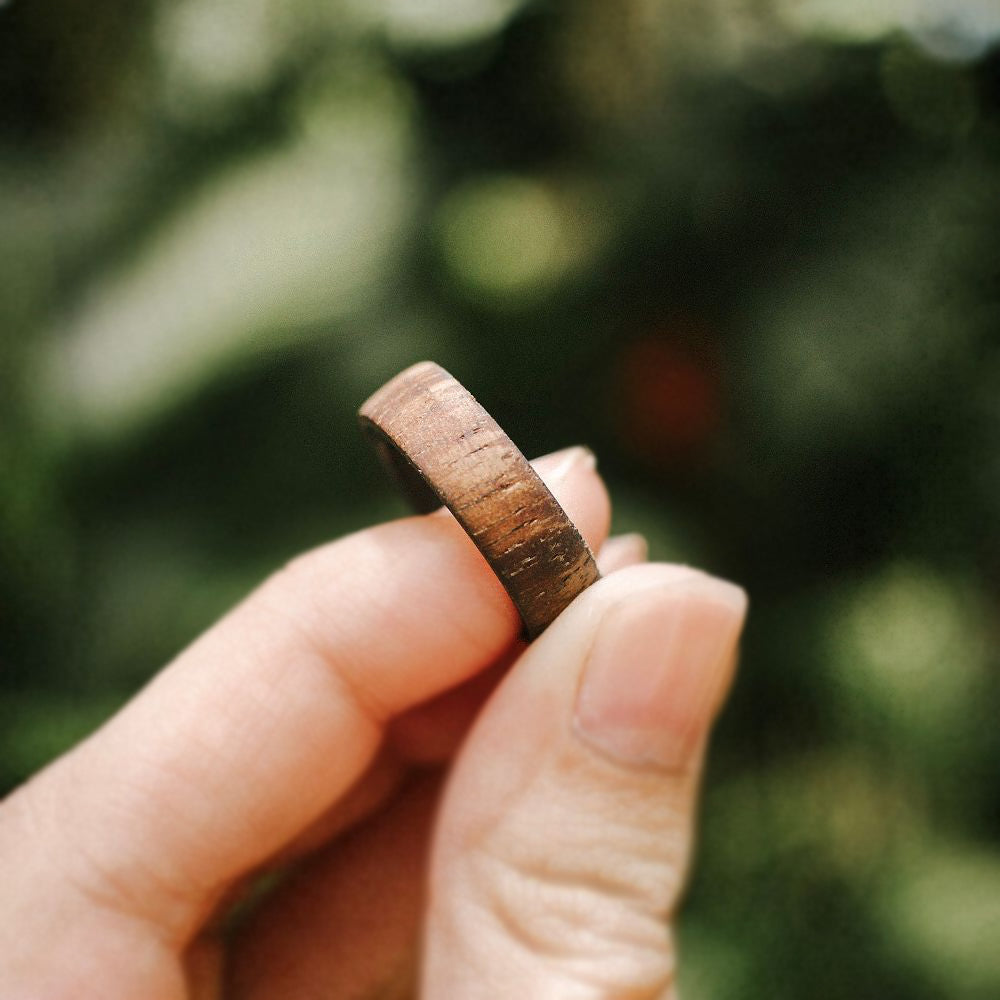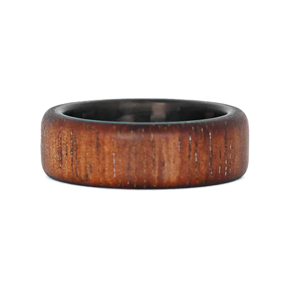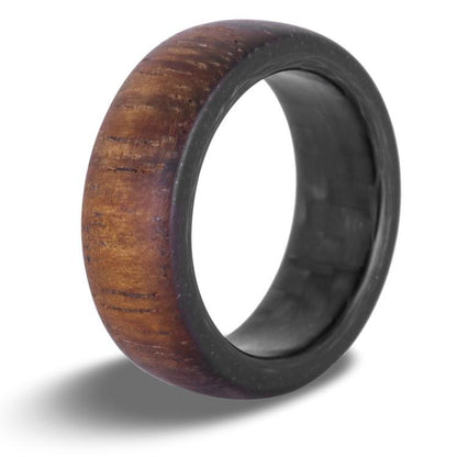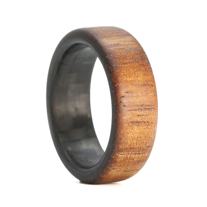 Just like marriage brings two souls together, this wedding band blends Koa wood and carbon fiber to create a work of art. This hard-wearing ring comes with a wood conditioner for maintenance. The band combines the qualities of the exotic Hawaiian Koa wood, such as varied grain patterns and deep attractive colors. Hawaiian Koa wood is considered sacred and is highly revered. It's also a symbol of strength, just like the unbreakable bond you share with your beloved. The inside of the band is lined with carbon fiber making it hypoallergenic. Handmade from high-quality materials, this band is designed to meet all your expectations when it comes to style, comfort, and durability. The unique combination of Koa wood and carbon fiber interior creates a stunning contrast that brings out the best in both materials. The rich, warm tones of the Koa wood are accentuated by the sleek, black carbon fiber interior, giving the ring an edgy, modern look that is sure to impress. Not only is this ring a showstopper, but it's also comfortable to wear all day long. The smooth, rounded edges of the band prevent irritation, and the lightweight design ensures you won't even notice it's on your finger. Celebrate your love with a ring that is as unique and special as your relationship. Our Koa wood and carbon fiber men's wedding band is the perfect choice for anyone who wants a high-quality ring that will make a lasting impression.