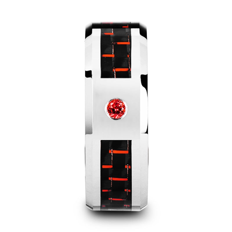 Men's Tungsten Wedding Band with Black & Red Carbon Fiber and Ruby