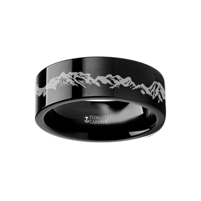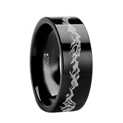 The sweet call of nature is brought into stunning focus with the formation of this black tungsten mountain range wedding band. A moving and majestic range of gorgeous mountains engraved in the black tungsten ring creates a willful and loving feeling for nature and its intrinsic beauty and divinity. Show your lover how much you care by incorporating something they love, something that calls to them, into the symbol of your commitment and your relationship. The way these mountains have been engraved into the metal allow for the imagination to run through their beautiful meadows, climb their impervious peaks, and enjoy the feel of freedom that only comes from being in nature. Loving someone so pure in their soul that they feel the call of the wild is a special thing. Embrace their sweet spirit and enjoyment of the outdoors with the perfect wedding band. The contrast of the mountains on the black metal canvas is sure to move anyone to tears of appreciation for its beauty. If this is the first wedding ring you have purchased for your lover, or an update to an age old romance, you are sure to take their breath away with this stunning creation.