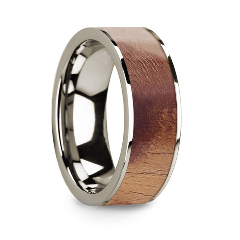 Profess your everlasting love for your significant other with this stunner. Featuring an olive wood inlay, the ring is as majestic as it is bold. It's powerfully contrasted by white gold and a pristinely polished finish. The dark brown and black streaks on the inlay give this ring a mesmerizing look. Olive trees live for over 300 years, and their wood is resistant to rot and decay. Accurately represent your never-ending and indestructible love with this number. Just like the olive branch is considered a symbol of peace, by putting on this ring, you bring peace, joy, and happiness into your marriage. The flat band and comfort fit compliment an already outstanding design and make it easy to wear or remove. This piece will last for years; the combination of the durability of white gold and olive wood and a resistance to tarnish and corrosion will guarantee its longevity.