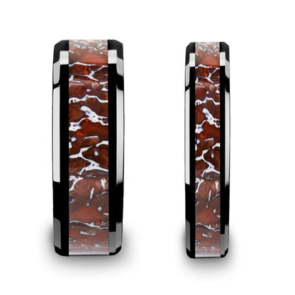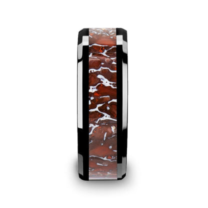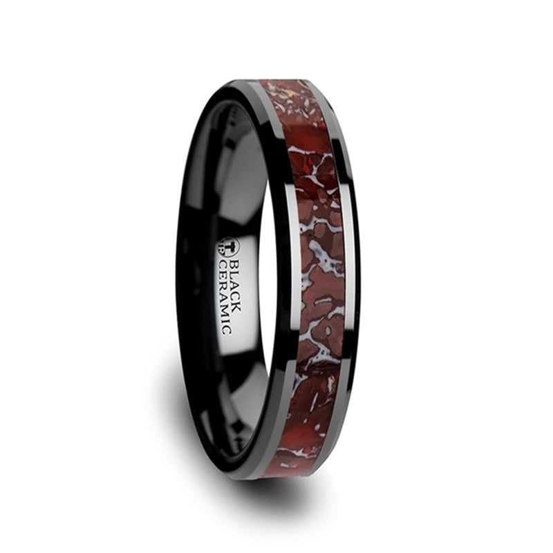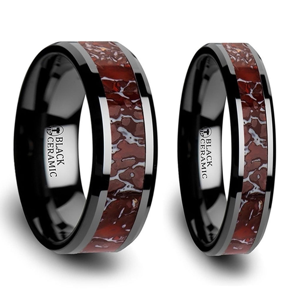 Red Dinosaur Bone Inlaid Black Ceramic Couple's Matching Wedding Band Set