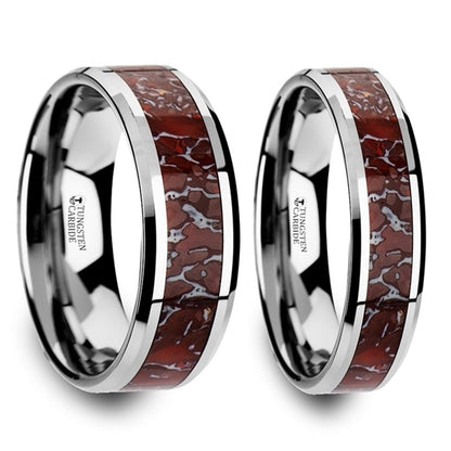 Red Dinosaur Bone Inlaid Tungsten Carbide Couple's Matching Wedding Band Set