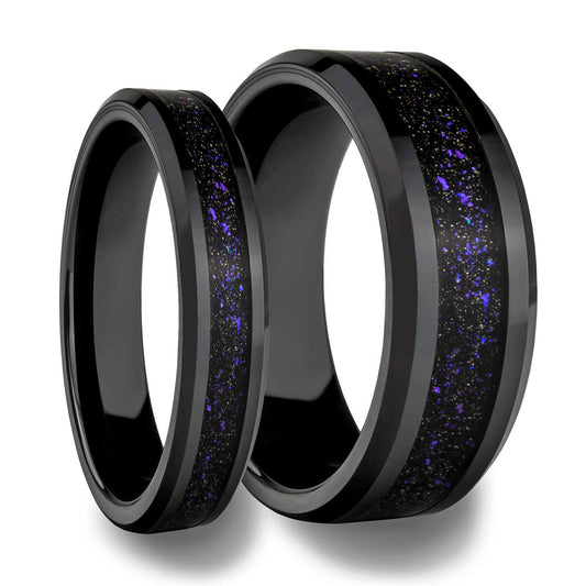Black Ceramic Couple's Matching Wedding Band Set with Purple Galaxy Goldstone Inlay