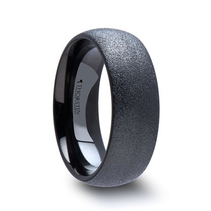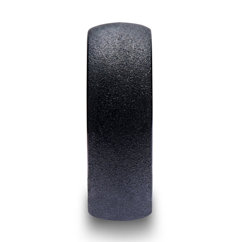 There is a quality of depth found in the color black. It speaks to refinement. An affinity to the color itself suggests a creative playfulness, a quality of the most desirable kind. You bring it out in one another. Which is why, the dark is no longer as worry some or depressing, these are all things only someone in love could understand. You get it. The color leaves room for the imagination to dance, and play. To think of all of the things you will do, and be together. This Sandblasted Tungsten carbide wedding band leaves room for every memory you create together to dance over its intricate domed surface. We wish you a life full of moments dancing in the dark of candle light.