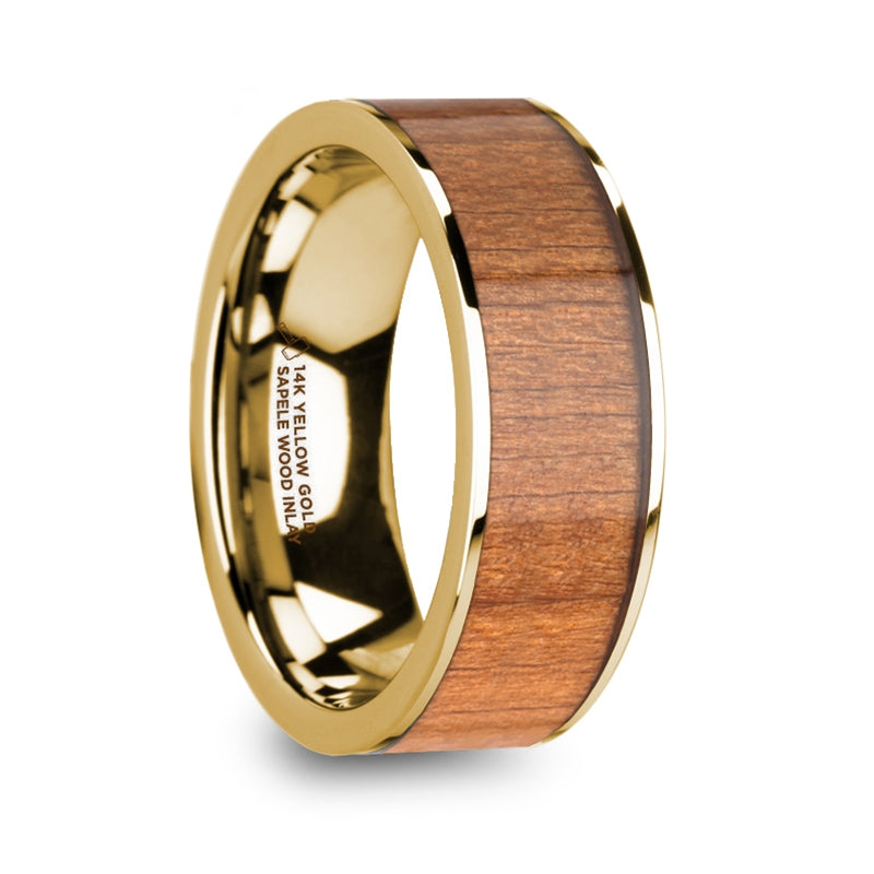 Sapele Wood Inlay 14k Yellow Gold Men's Wedding Band