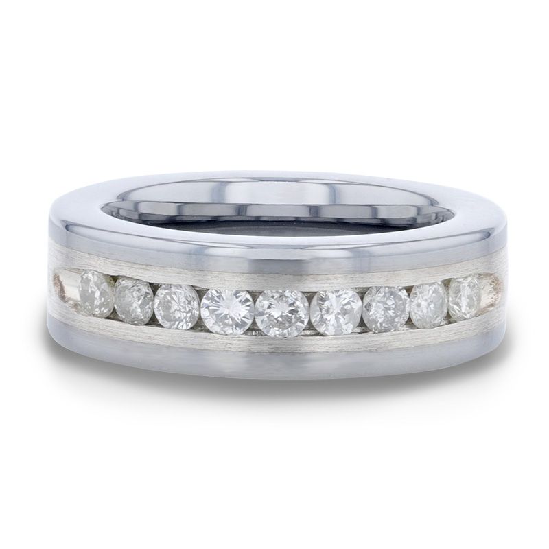 Silver Inlaid Tungsten Carbide Men's Wedding Band with 0.9 ctw Channel Set Diamonds