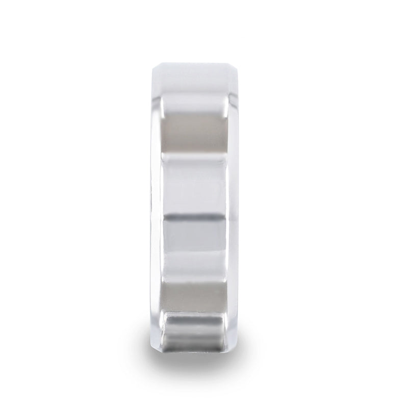 Lovingly forged by experienced hands is this downright debonair ring. The beveled edges and brushed finish add a subtle sophistication to this silver wedding band, making it the perfect choice for a modern groom with an eye for design. This piece offers the best of all worlds, a modern yet classic design crafted with a precious metal. It's one fetching piece that's minimalistic and elegant at the same time. The band plays with a mixture of a gorgeous brushed finish and smooth, shiny edges, exuding a modern appeal. A comfort fit completes this masterpiece for the perfect fit, guaranteeing that this piece will be a favorite in your life, just like your significant other. Express your unique style, commitment, and love with this sterling wedding band. It's precisely crafted using cutting-edge techniques to deliver a thoughtful sleek style for the savvy groom. You can top off any outfit by adding this statement wedding band to your attire.