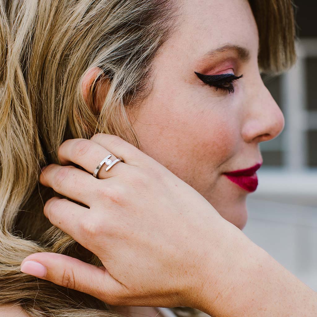 The exceptional spiral negative space tension-set lab-created diamond titanium women's wedding band combines strength and femininity in a bold and delicate design. Featuring a brilliant above-earth diamond, this ring doesn't include the traditional stone settings that are found in most gemstone wedding bands today. The spiral tension-set diamond women's engagement ring uses just the tension of the titanium to hold the lab-grown diamond in place. The result is a visually stunning and unique design that she will love to show off every day of her life. This eye-catching spiral women's wedding band will elicit compliments for years to come with its asymmetrical titanium style.