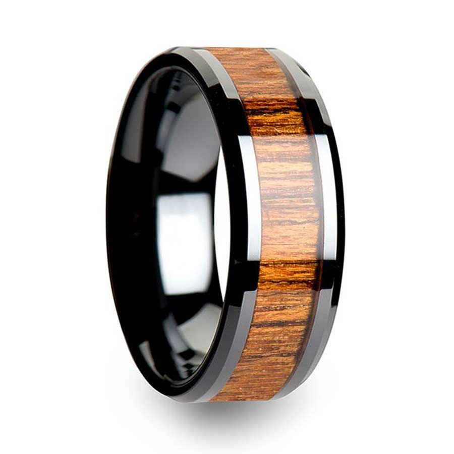 If you and your better half have been mulling over the decision of getting wedding rings that do not conform to traditional bands, then these beautiful pieces crafted with black ceramic with teak wood inlay is the way to go. The elaborate inlay demonstrates the creativity of the craftsmen and the versality of the wearer. This classy set that is top shelf will always have an unequalled appeal and an unfading effect on you, your spouse and all those around you. These are the kind of rings that can become family heirlooms and be handed down through the generations to come.
