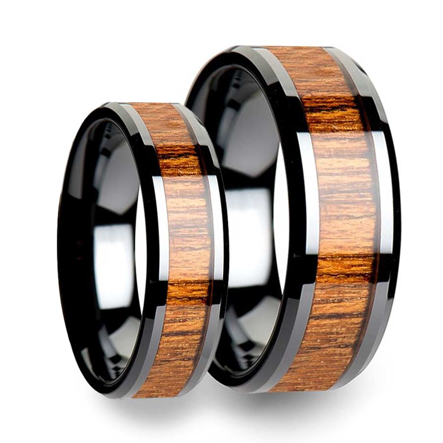 Teak Wood Inlaid Black Ceramic Couple's Matching Wedding Band Set