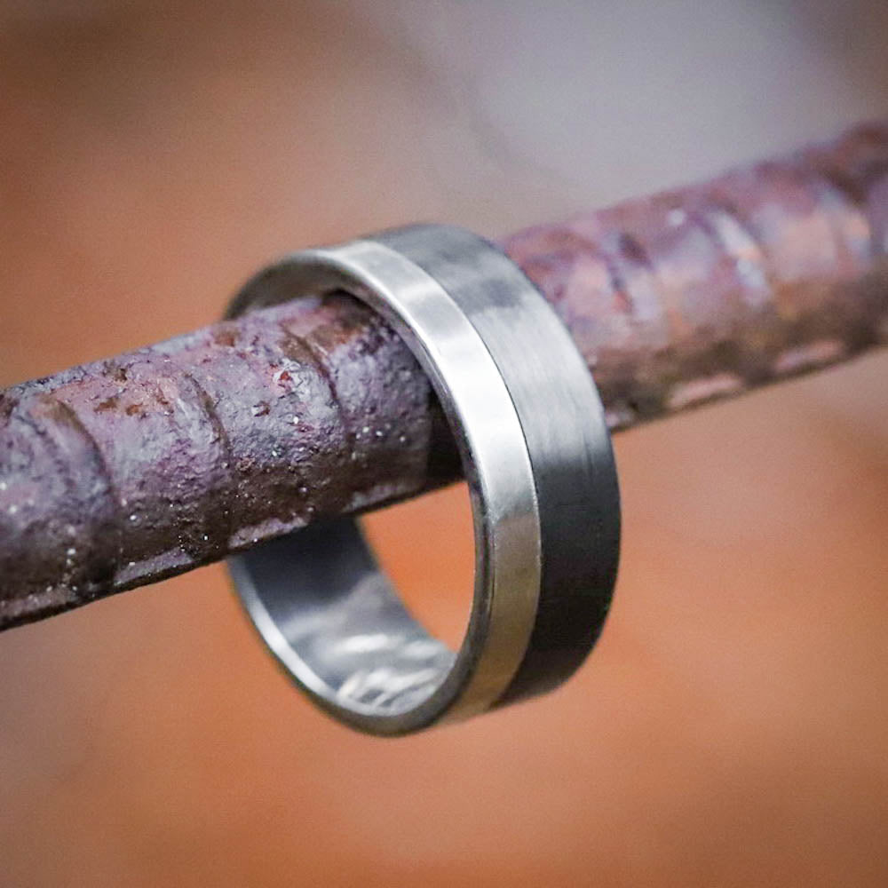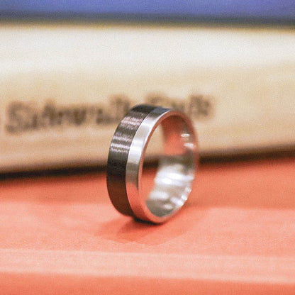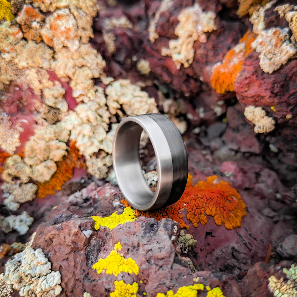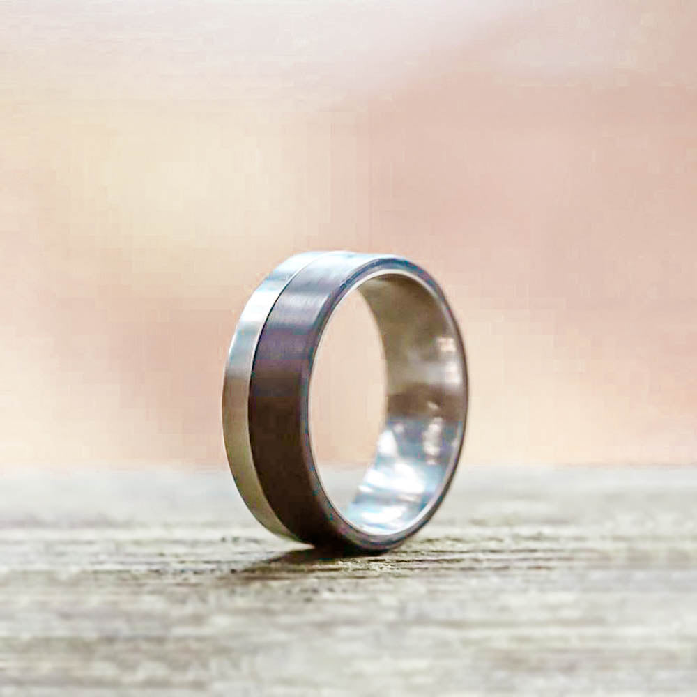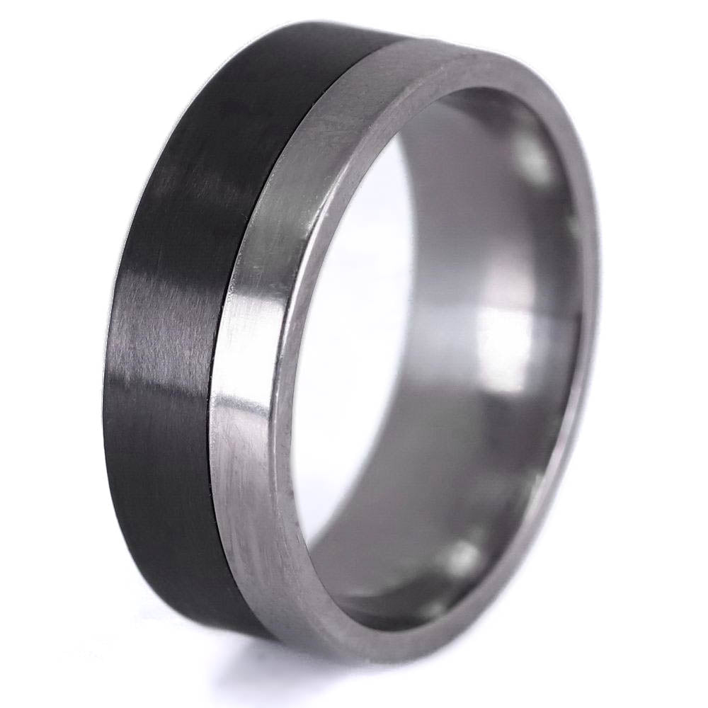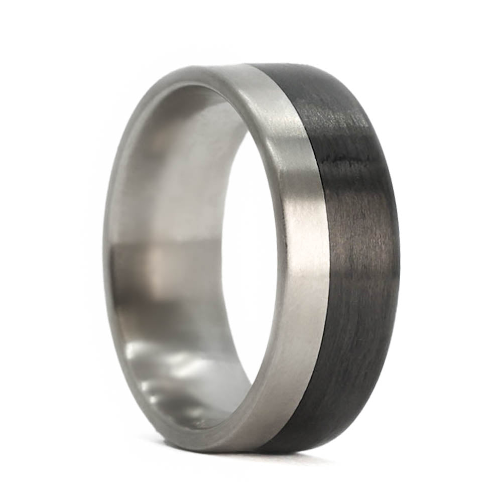 This masterpiece men's wedding band gives off a cool vibe. Say 'I do' to the love of your life with sophisticated style. This ultra-modern band features titanium and carbon fiber that deliver a unique, edgy look. Both materials are lightweight, extremely durable, and hypoallergenic, making the ring perfect for a groom with sensitive skin and who prefers a lighter feel on the finger. Infinitely rugged and stylish for everyday wear, this sleek piece will still look great even after a long hard day's work. This masterpiece is a symbol of contemporary, unexcelled style that provides revolutionary comfort. For a modern gentleman looking for a ring that reflects his lifestyle, this wedding band was specially crafted for you. This fashion-forward wedding band for men has a soft luster and subtle variations that are accommodating to skin tones, making it one of the most sought-after rings. What better way to express your commitment and style than with this fetching wedding ring.
