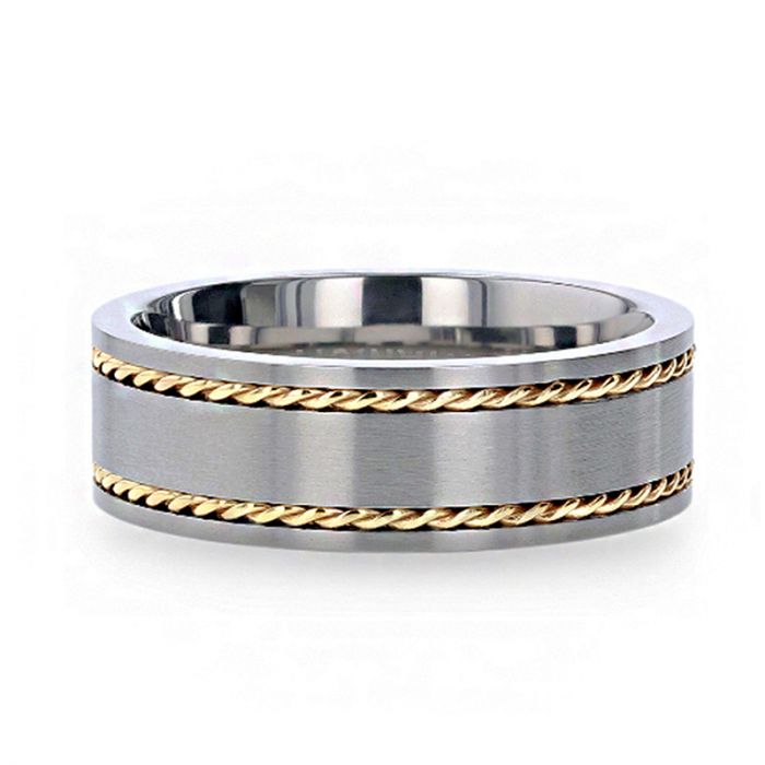 Dependable, practical, innovative, and downright classy just like you, this snazzy men's titanium wedding band with dual braided yellow gold inlays will stand the test of time. Crafted with great precision and impeccable style to symbolize the weaving of two lives together, this titanium men's wedding band is a perfect symbol of your forever love. This unique ring comes with a braided gold inlay that gives the band an elegant and stunning look. The brushed finish perfectly offsets the gold inlay's shiny hues, making it the perfect match for any outfit in your closet. This titanium ring has a flat profile that makes it suitable for different finger types. It also has a comfort fit that enables you to easily push it over your knuckles when putting it on or removing it. For a groom who breathes courage and bravery, this ring will remain loyal and true through the years.
