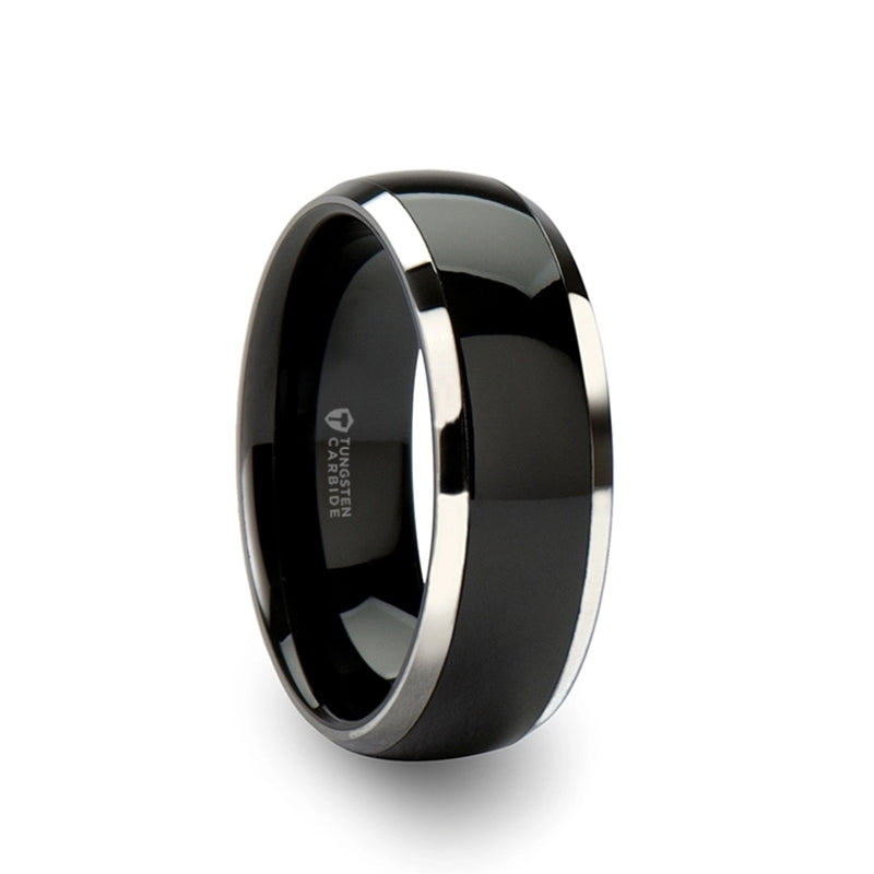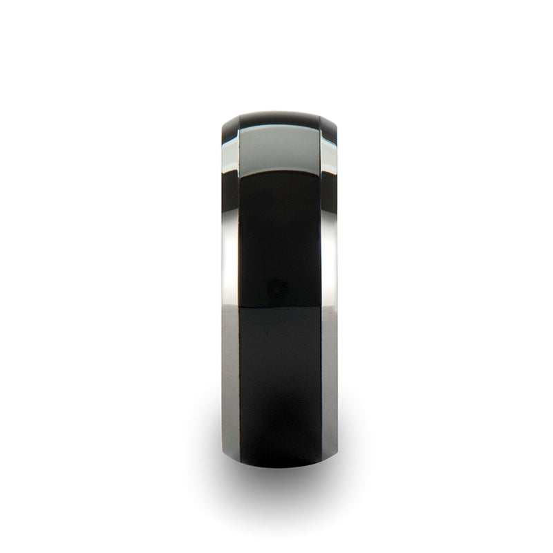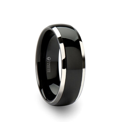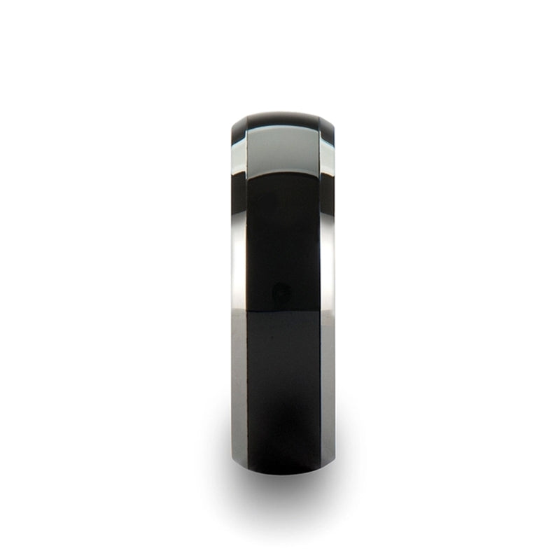 As the saying goes, opposites attract and this beautiful black and white ring could be used to describe how different you and your loved one are whilst also showing just how well you go together! This ring's reflective black ceramic domed center is highlighted by its contrasting silver Tungsten carbide beveled edges, which gives the ring a sporty and contemporary look. Fitting for both men and women alike, couples who prefer a matching set could more than do so! Made from Tungsten carbide, which is one of the newest and strongest metals to be used in jewelry such as wedding bands, this ring is ideal for men and women who are tired of rings that damage or scratch easily.