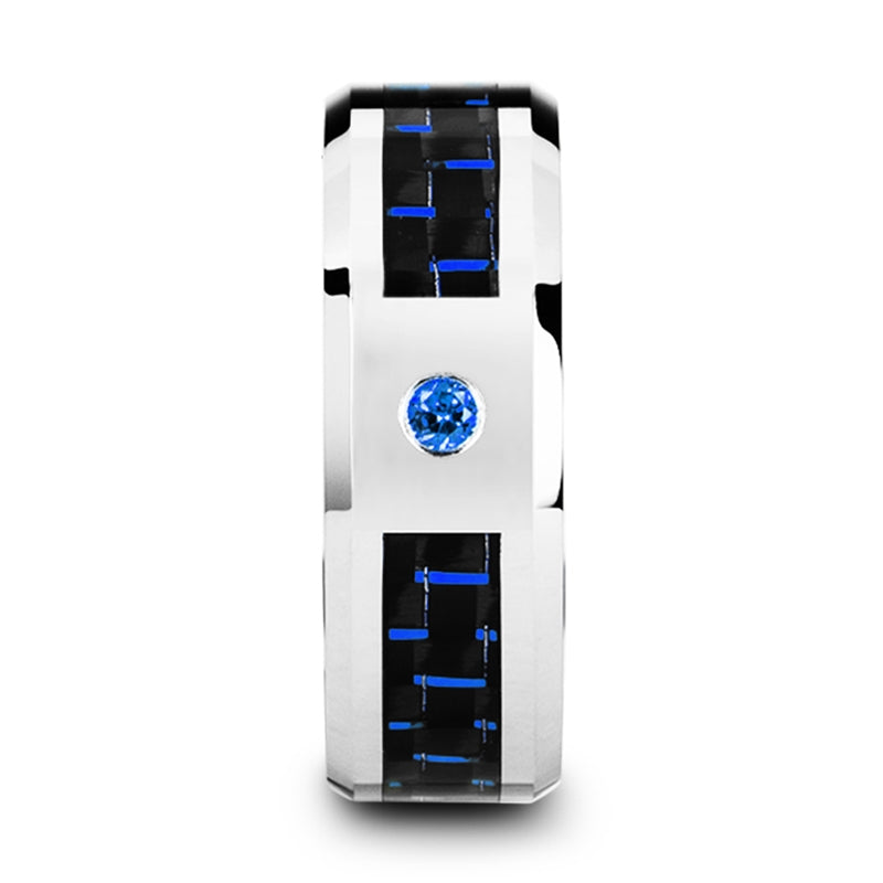 Tungsten Men's Wedding Band with Black & Blue Carbon Fiber and Sapphire