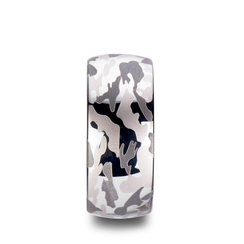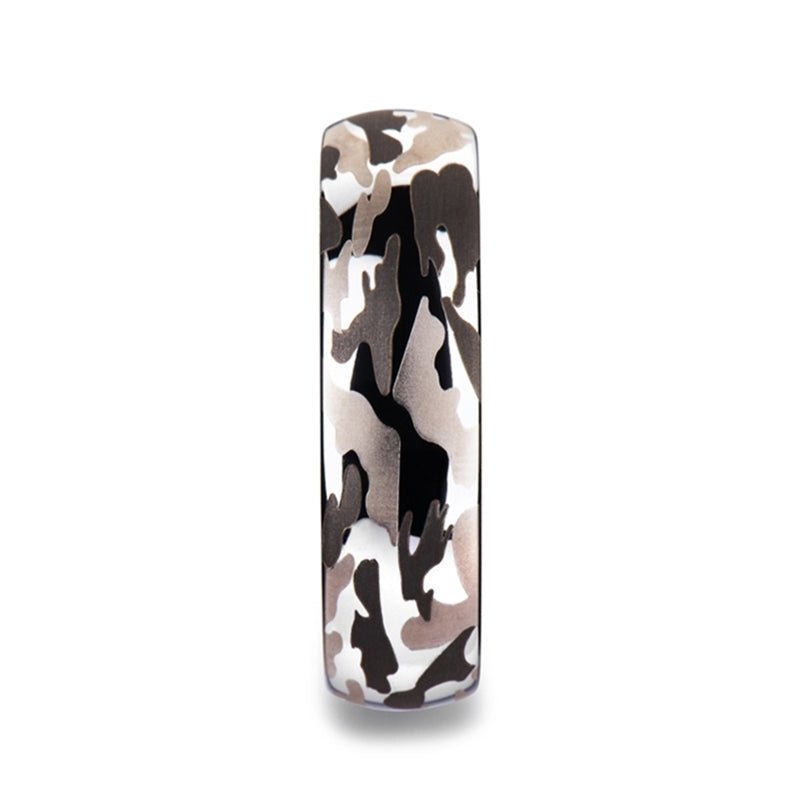 Built strong from Tungsten carbide with a proud display of black and grey camo patterns, this ring has a subtle domed shape. The toughness gene is in your DNA. Maybe you are in the armed forces. Maybe you have a background in helping people. You won't back down from anything; ready to stand for what is right and good. The camo ring is a symbol of that selfless drive to help and care for others. You know you will take the same high values of into your marriage. With this ring, your partner is who you will cherish from this day forward. This unique design with sloping edges, a perfect blending of the most scratch resistant metals on earth, and the toughest looking modern camo design, it matches greatly with the rugged camouflage that consists of different shades. The bond that it represents is one of true acceptance and unique and creative characteristics that you've found in one another.