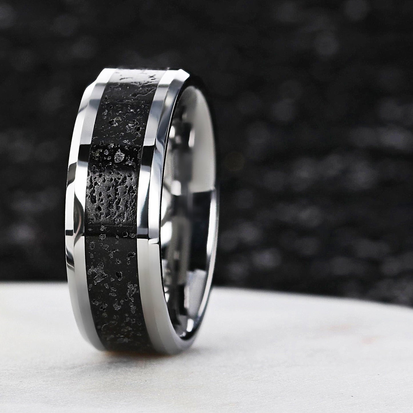 If you want to demonstrate a love that's as pure, strong, and true as it is exciting, this men's polished tungsten wedding band is the perfect piece. Branch out from ordinary wedding rings and choose a men's tungsten wedding band. Tungsten rings are loved for a long list of desirable characteristics, including unmatched durability, quality, and affordability. Wearing this men's lava rock ring will be a source of pride. Even with its incredible strength, tungsten is a wearable metal that rests well on your finger and ensure daily comfort. The black and gray lava rock stone inlay enhances the ring's look with a natural texture while signifying the timelessness of your relationship. Just like your union, this nuptial band is highly unique thanks to the genuine lava stone inlaid into the tungsten band. The refined look will be a daily reminder of your wedding vows.