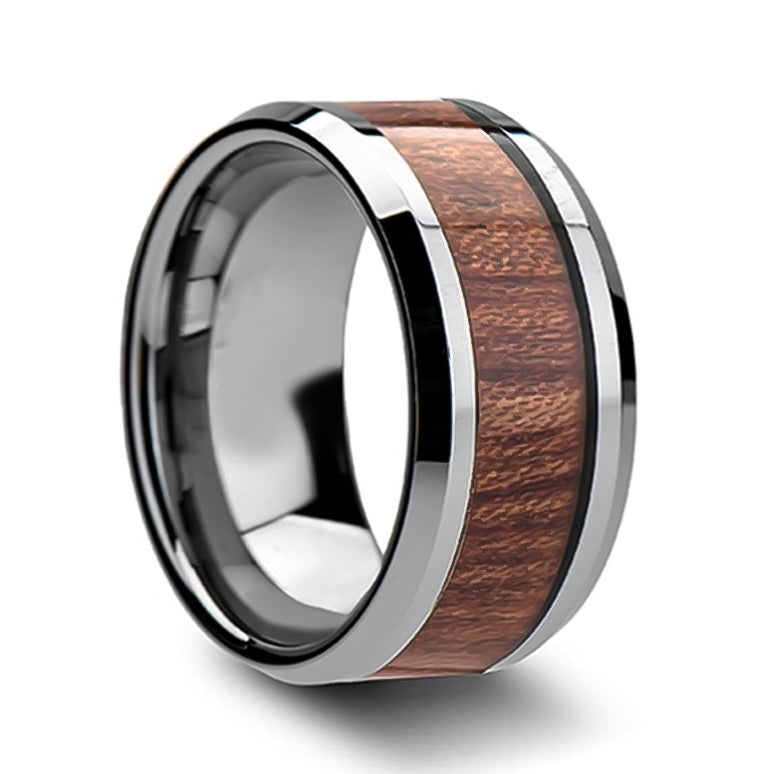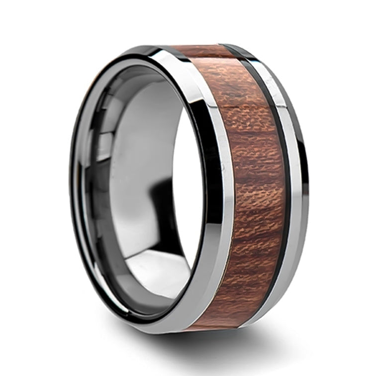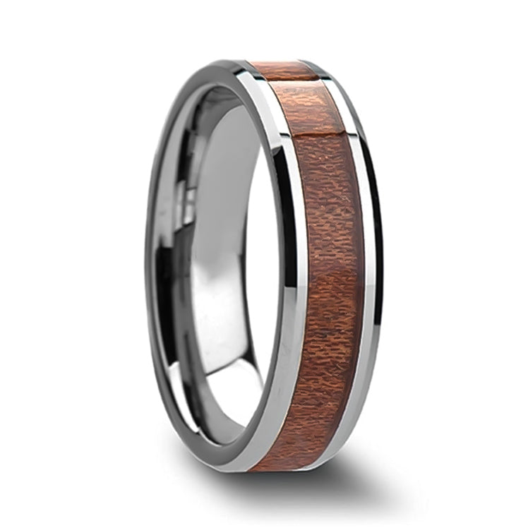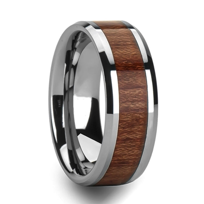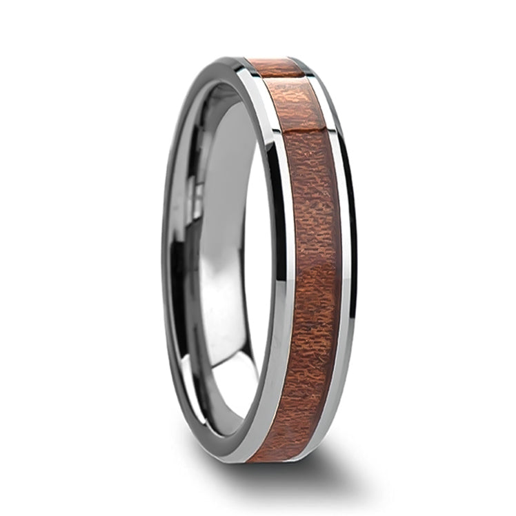 Tungsten Men's Wedding Band with Mahogany Wood Inlay