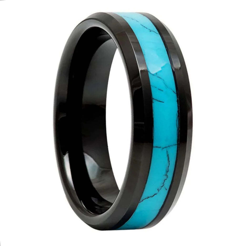Introducing our turquoise inlay black tungsten men's wedding band - the perfect blend of style and durability, while remaining affordable! This edgy piece will have you feeling like a true rockstar, with its sleek black tungsten base and stunning turquoise inlay. Not only does this ring look amazing, but it's built to last. Tungsten is known for its toughness and scratch-resistant properties, making it the ideal choice for active guys who want a wedding band that can keep up with their lifestyle. And let's not forget the added bonus of the hypoallergenic materials - no more itchy, irritated skin! Whether you're tying the knot or just looking for a stylish accessory, our turquoise inlay black tungsten men's wedding band is sure to impress. So why settle for a boring, flimsy ring when you can have something that looks and feels amazing? Order yours today and get ready to turn heads.