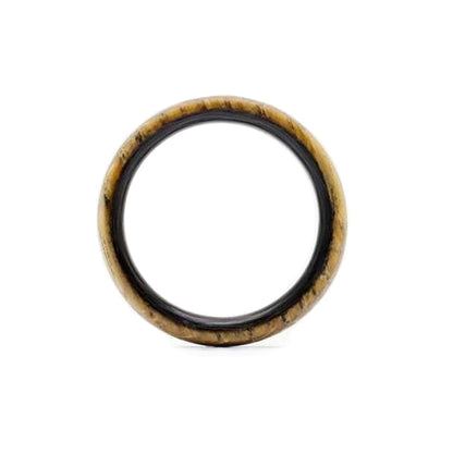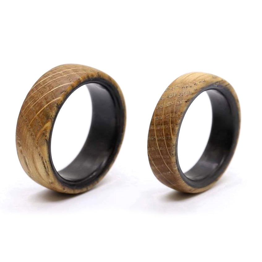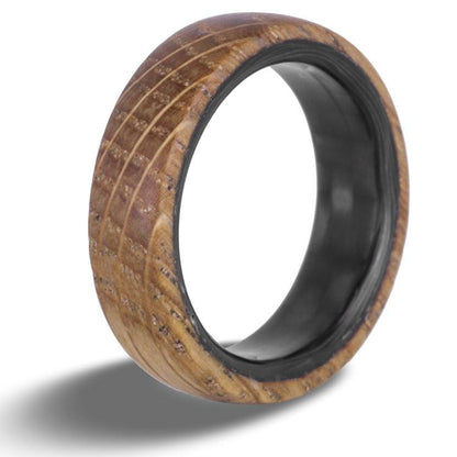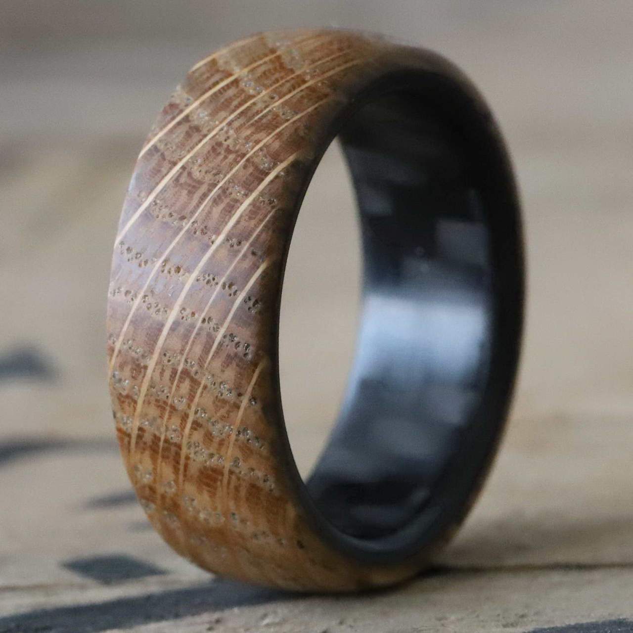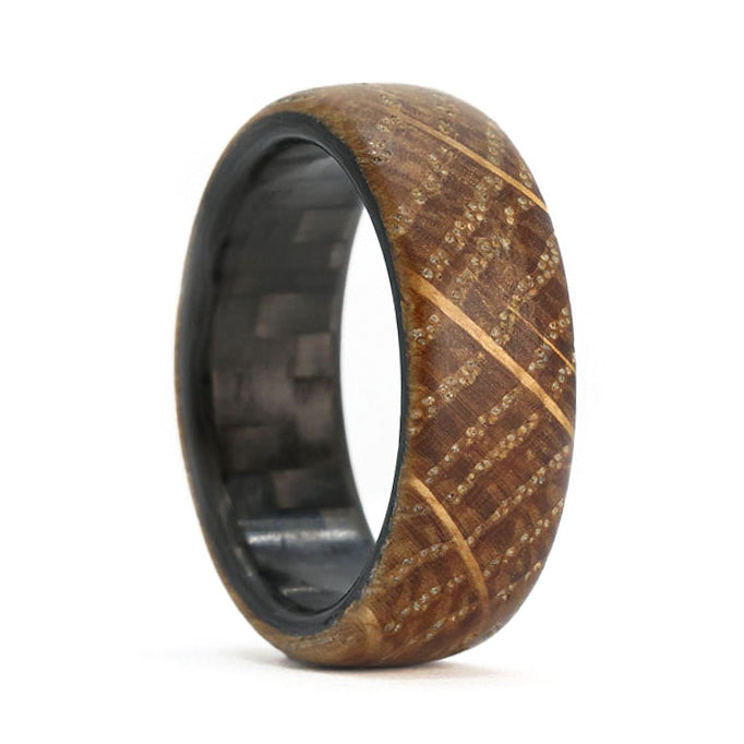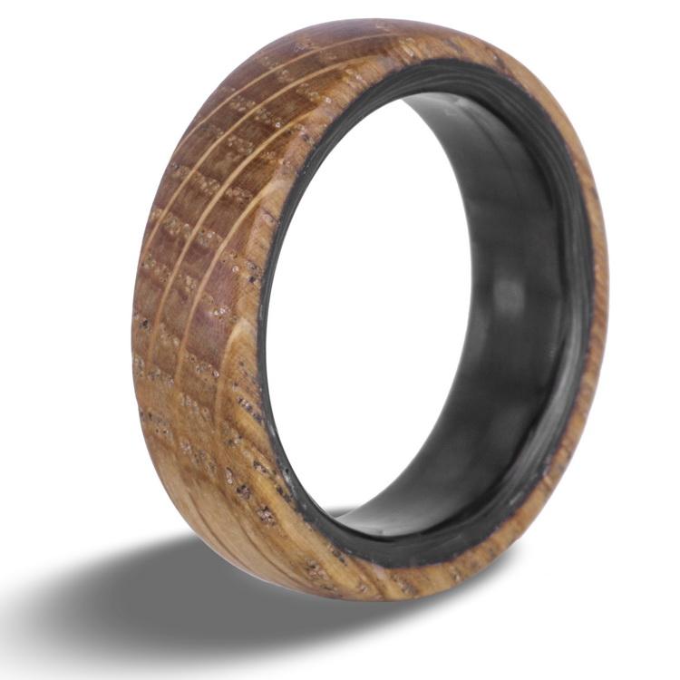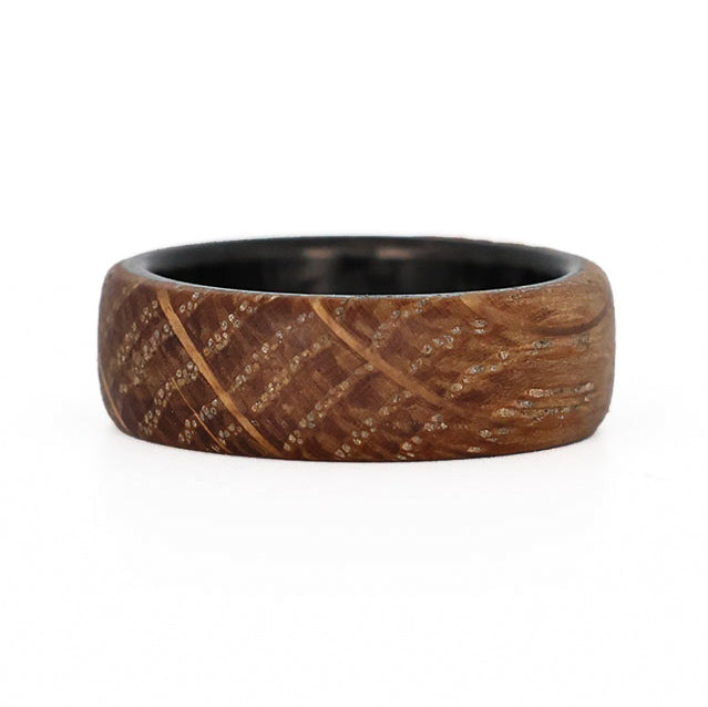 Reaching for your favorite blend of whiskey to toast to your forever love on your wedding night can have a regal and awe-inspiring effect when you look down your hand and spot this fine ring. The band is made from whiskey-soaked barrel wood that has been perfectly crafted and treated to enhance its durability. Just as whiskey is perfectly balanced to achieve a uniform blend of all flavors, this ring is complemented with carbon fiber to bolster its strength. This blend of two different materials to make a long-lasting band is a true symbol of your love and union.