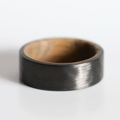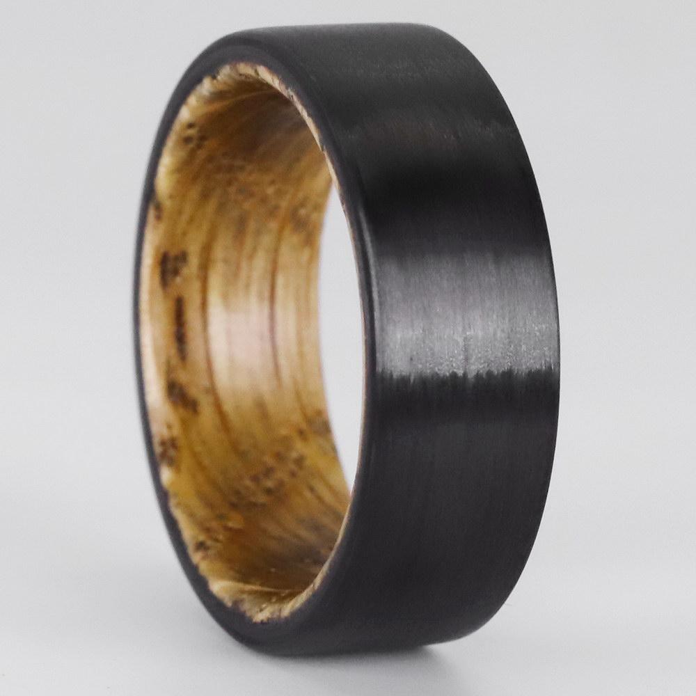 For the lovers of neat, aged, or rich whiskey, this carbon fiber wedding band is specially made for you. Whiskey barrels provide the main raw materials for making the ring. To strengthen the band’s durability, the whiskey-soaked oak is treated with waterproof jewelry resin. The band comes with a carbon fiber that’s used to bolster its strength while adding an amazing contrast. Carbon fiber prevents bending or shifting of the wood due to water exposure and forms perfect rounded edges. A great conversation starter wedding band as you honor your drink of choice, you’ll fall head over heels for this masterpiece just as you did your beloved. Combining space-age material and a classic contemporary style, this ring is anything but ordinary. If you love a glass of whiskey after a long day, this is the perfect ring for you. It's stunning, dark, and an authentic work of art. This whiskey barrel wood and carbon fiber men's wedding band is one of the most charming and, at the same time, classiest styles. And you don't have to be worried about water damage; the band is coated to make it water-resistant and extremely durable. The piece is made out of 100 percent real whiskey barrel wood and carbon fiber, making it extremely unique. Both materials are sturdy, yet you'll be amazed by how little this ring weighs. The wood has an incredible color profile that accentuates the carbon fiber, creating a stand-out piece that blends simple elegance with rustic appeal.