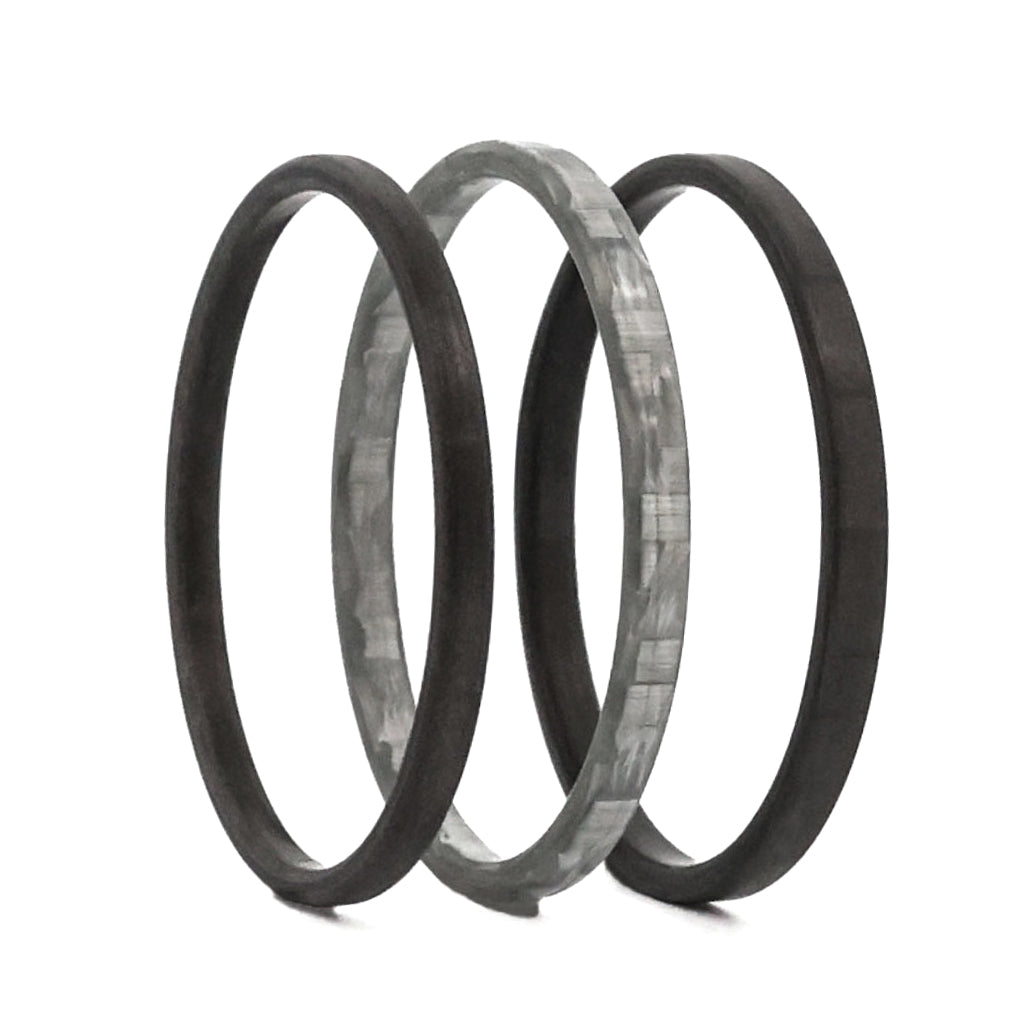 This set of three stackable carbon fiber wedding bands has all of the variety that you expect from a modern and beautiful wedding band stacker set.