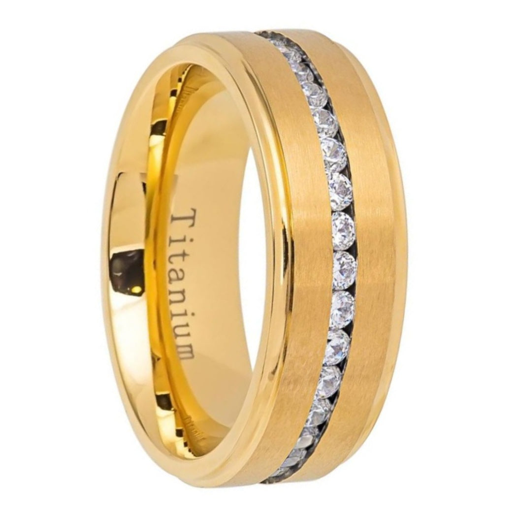 Yellow Gold Titanium Men's Wedding Band with Cubic Zirconia